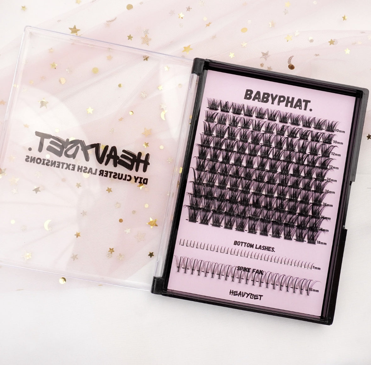 BABYPHAT: XL CLUSTER LASH TRAY WITH BOTTOM LASHES & SPIKE FANS by HEAVYSET.